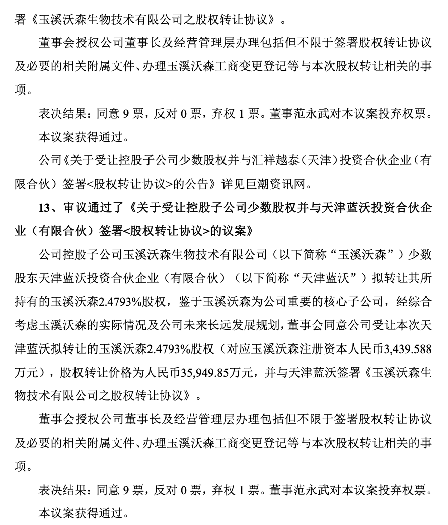 《关于受让控股子公司少数股权并与汇祥越泰(天津)投资合伙企业(有限合伙)签署 <股权转让协议> 的议案》及《关于受让控股子公司少数股权并与天津蓝沃投资合伙企业(有限合伙)签署 <股权转让协议> 的议案》的表决结果显示, 这两项议案均获得了9票同意,0票反对,1票弃权,弃权票则来自董事范永武。