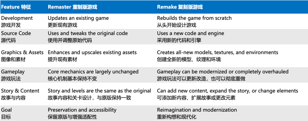 重制版游戏(remake)指的是在老款游戏故事情节的基础上,重新制作的新游戏。重置版游戏(remaster),又称复刻版游戏,指的是在不改变老款游戏内容和玩法的基础上,对画面分辨率和效果进行提升,本质上和老款游戏并无太大区别。以下为方便区分,简称为重制版与复刻版游戏。
