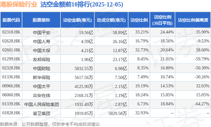12月5日港股保险行业沽空数据盘点,中国平安、中国人寿、中国太保沽空金额位居行业前三