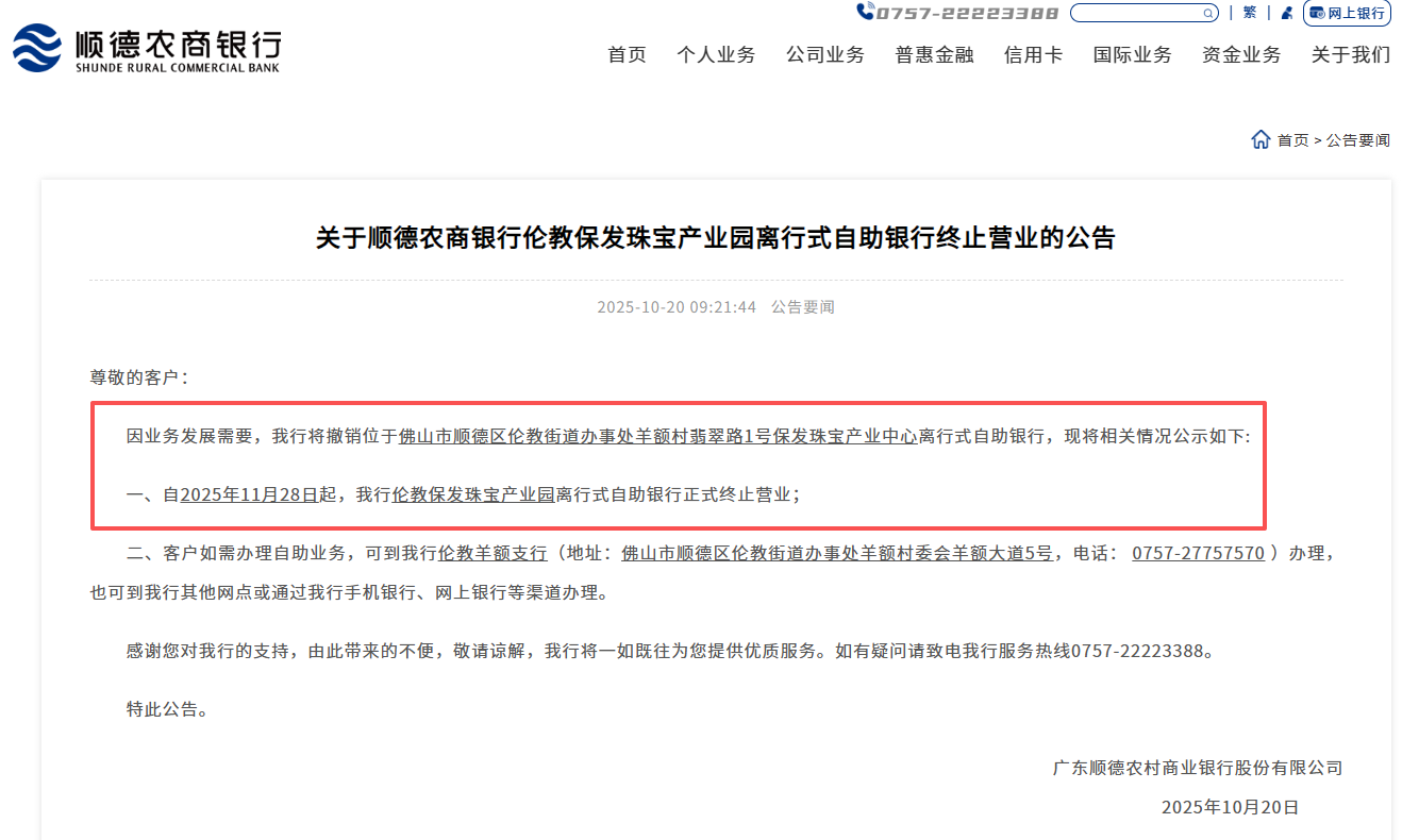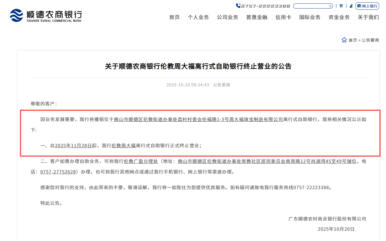 10月20日,顺德农商行公告,将撤销旗下的伦教周大福离行式自助银行和伦教保发珠宝产业园离行式自助银行。二者均将于11月28日起终止营业。公告称,撤销原因为“因业务发展需要”。