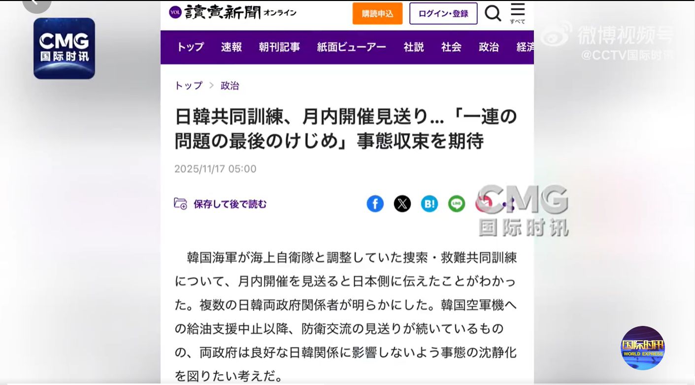 据CCTV国际时讯,外媒报道称,韩国海军已向日本海上自卫队转达了“将暂停原定于本月内举行的联合搜救演习”的意向。日本防卫省官员对此表示,“韩国海军将与日本海上自卫队就此次联合演习的时间进行调整”。