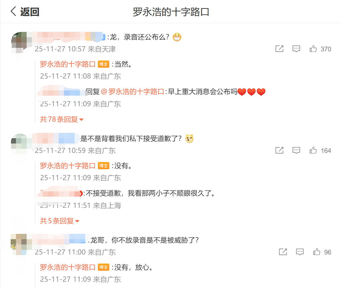 11月27日上午,罗永浩透过微博 @罗永浩的十字路口 评论区回应网友提问。有网友问及,“录音还公布么?”,罗永浩回应,“当然”。还有网友提问,“是不是背着我们私下接受道歉了?”对此,罗永浩表示,“没有。”此外,对于网友提出的“不放录音是不是被威胁了?”,罗永浩称,“没有,放心。”
