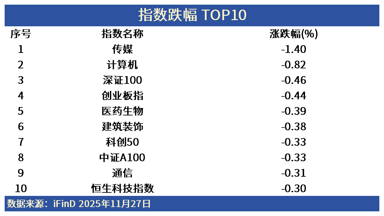 截至2025年11月27日A股收盘,传媒回调1.40%,欢瑞世纪、富春股份跌幅居前。计算机回调0.82%,品茗科技、石基信息跌幅居前。