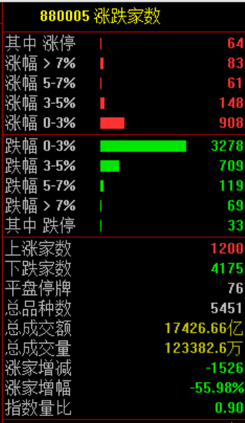 两市共1200只个股上涨,64只个股涨停,4175只个股下跌。