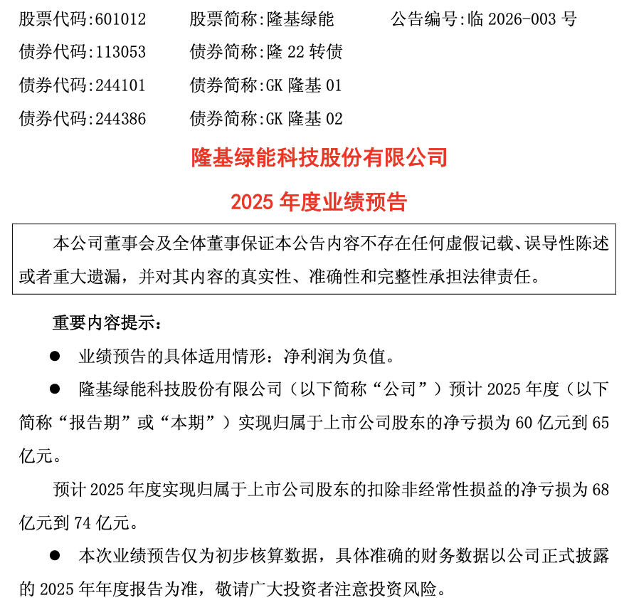 1月18日,隆基绿能(601012)披露2025年度业绩预告,经财务部门初步测算,预计2025年度实现归属于上市公司股东的净亏损为60亿元到65亿元。预计2025年度实现归属于上市公司股东的扣除非经常性损益的净亏损为68亿元到74亿元。