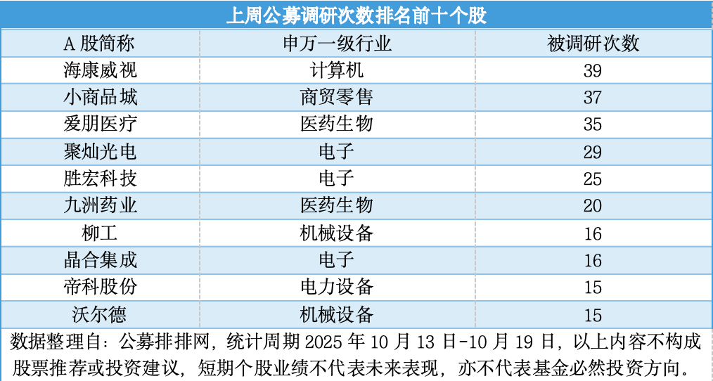具体来看,海康威视(002415.SZ)上周被调研39次居首,成为最受公募机构调研青睐个股,参与调研公募机构包括嘉实基金、南方基金等39家机构,调研方向上主要了解其经营情况。