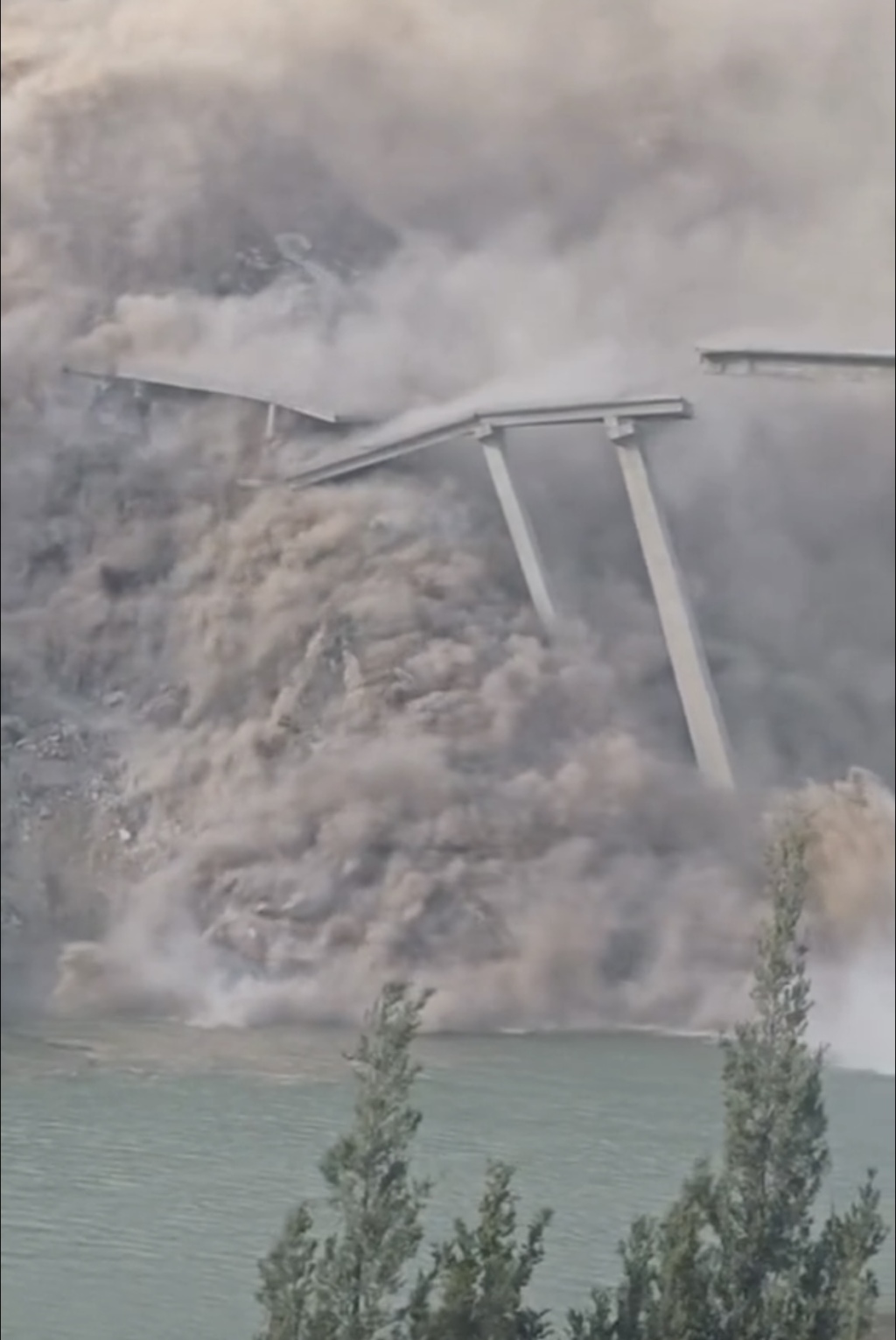 现场拍摄的视频画面显示,随着连续的巨响声,架设在河面之上的公路桥梁靠近山体一侧的结构率先断裂,桥体部分构件迅速坠落,现场升起大量烟尘。与此同时,镜头外传来人员的惊呼声 “桥没得了”。