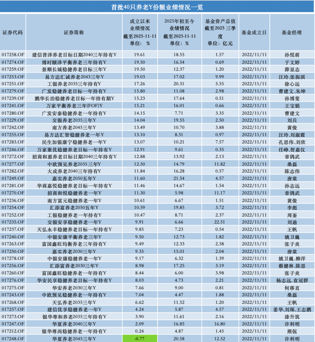 澎湃新闻记者据Wind数据统计,最早一批养老目标基金Y份额成立日期为2022年11月11日,距今已满三年的时间。
