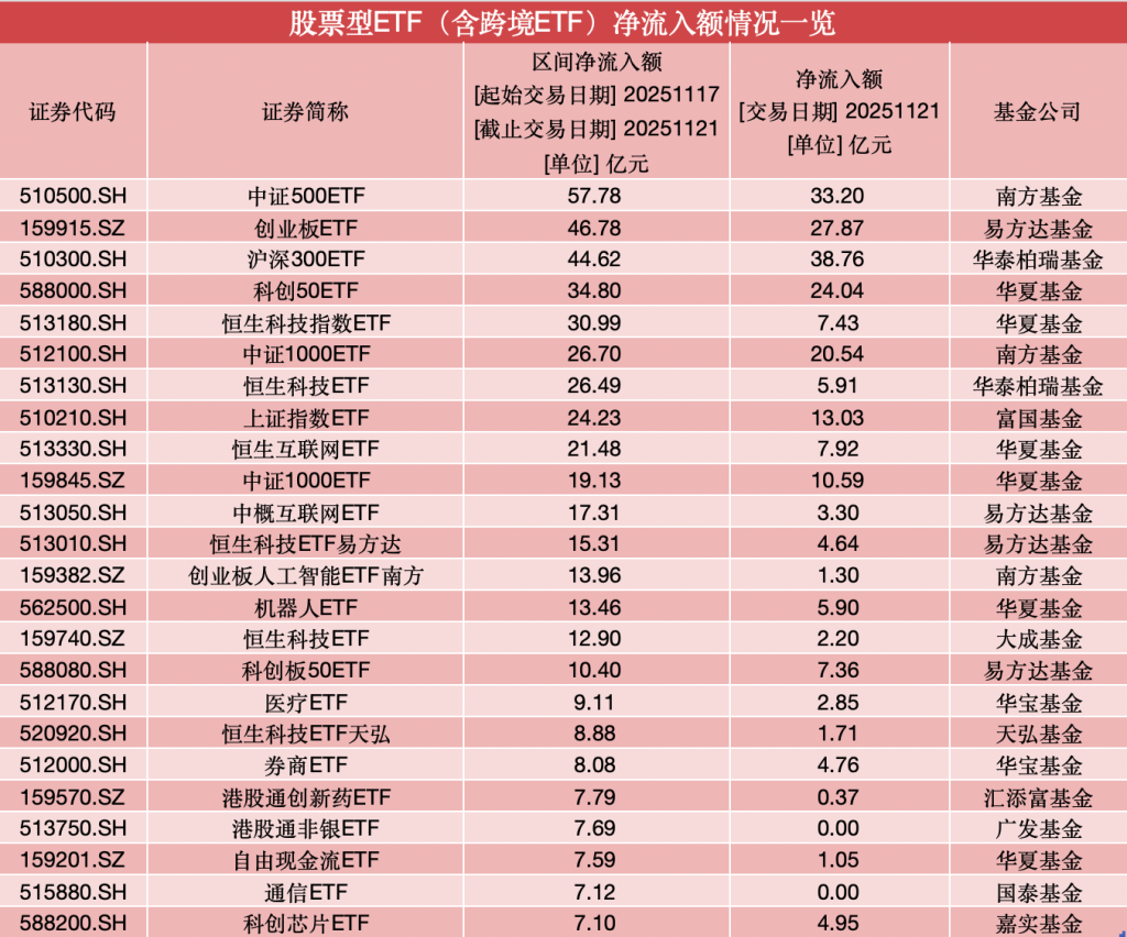具体来看,11月21日,华泰柏瑞沪深300ETF、南方中证500ETF分别以38.76亿元、33.20亿元的净流入额位居第一、第二,易方达创业板ETF、华夏科创50ETF、南方中证1000ETF单日净流入额也均超20亿元。